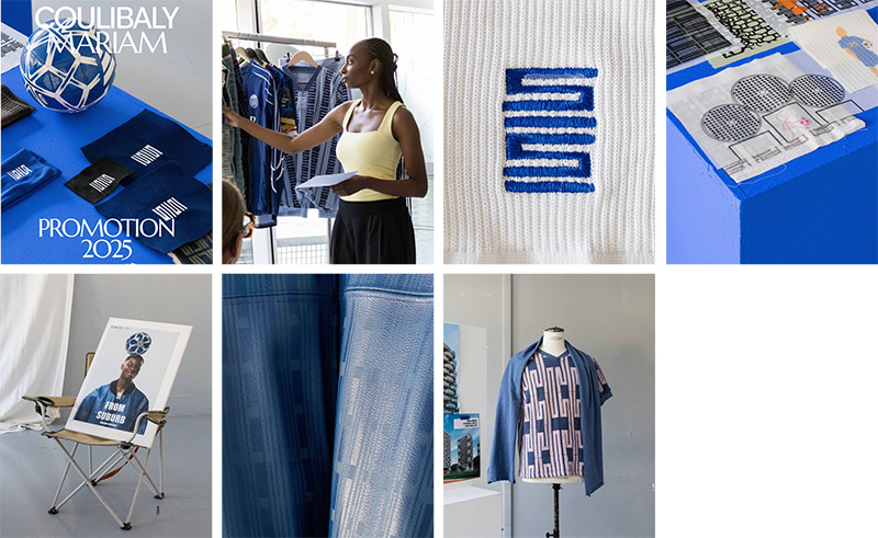 From Suburb isn’t just about pieces to wear. They are pieces to bear witness, to share, to express through my perspective as a textile designer, the richness and questioning of the world I come from. It is a form of memory, a way of taking a step back: a medium steeped in a culture born on the periphery. I draw inspiration from the influence of soccer in the suburbs, from the music that shaped me, from the graphics of the concrete grid towers. I use finishing techniques, architectural knits, embroidery and all the intimate details that make textiles so sublime.