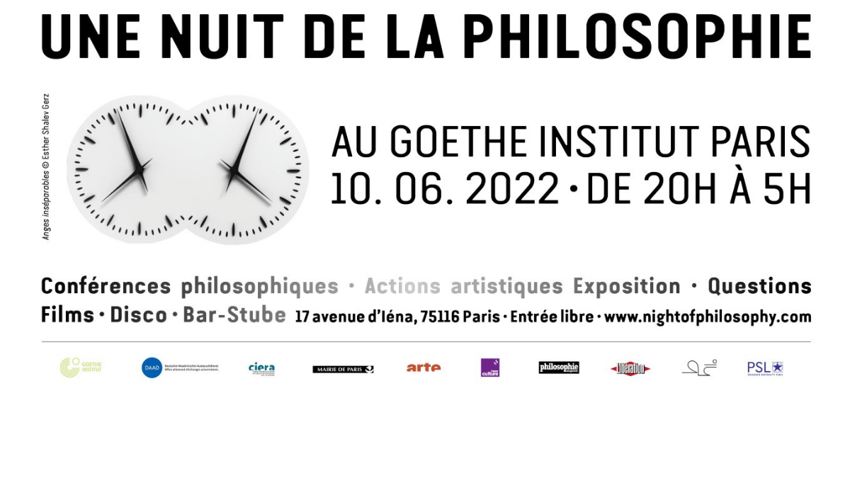 The next Night of Philosophy will take place on June 10 at the Goethe Institut, 17 avenue d'Iéna, in partnership with neighboring artistic institutions (Musée d'Art Moderne, Galiéra, Guimet, Palais de Tokyo, EESC).
