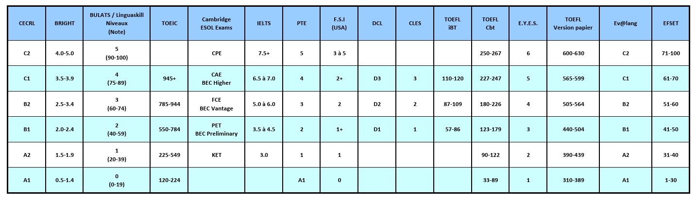 Correlation table between the levels of the Common European Framework of Reference for Languages (CEFR) and the main English tests and certifications :